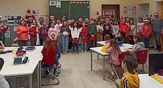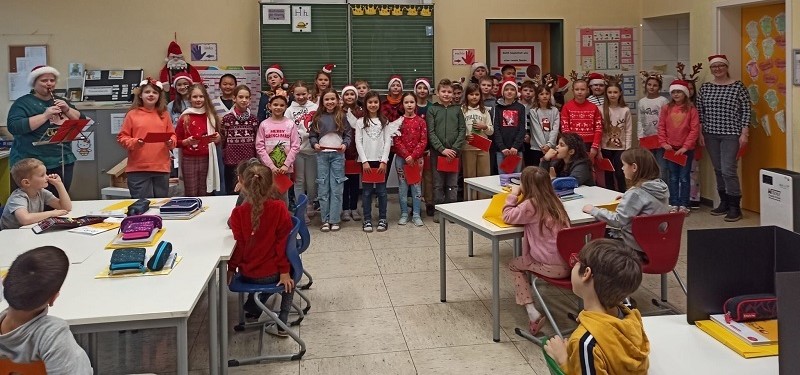 Mit ihren Englischlehrerinnen Frau Sinn und Frau Schmidt studierten die Viertklässler*innen Lieder wie „I hear them“ oder „We wish you a Merry Christmas“ und ein Gedicht ein. Am Donnerstag vor den Weihnachtsferien gingen sie dann alle von Klasse zu Klasse und trugen, bekleidet mit Weihnachtspullis und mit Weihnachtsmannmützen oder Rentiergeweih-Haarreifen, ihr kleines Programm vor.