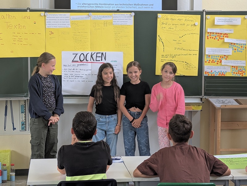 Sie brachte uns bei, wie man mit dem Internet richtig umgeht und zeigte uns die Gefahren des Internets. Sie teilte uns in Gruppen auf und dann versuchten wir den Master Code zu knacken, denn das Schulnetzwerk wurde gehackt. Um den Master Code zu lösen, mussten wir Aufgaben auf Plakaten lösen, die wir dann unseren Eltern am Nachmittag vorstellten. Dafür mussten wir an den verschiedenen Stationen Arbeitsblätter bearbeiten, damit wir eine Zahl herausbekommen konnten, um den Code knacken zu können. Bei den Aufgaben ging es um das Thema „Zocken“, „Chatten und Texten“, „Stress“ und „Cybermobbing“.
