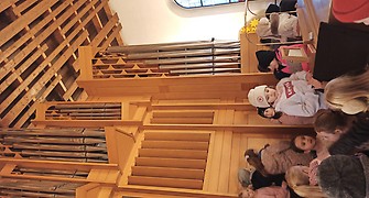 Herr Pfarrer Reith begrüßte uns herzlich und ließ die Kinder spielerisch die Kirche entdecken. So erhielten die Kinder Wortkärtchen und suchten die darauf genannten Gegenstände. Dabei erkundeten die Kinder die ganze Kirche und Pfarrer Reith beantwortete ihnen allerlei Fragen. Der Höhepunkt war die große Orgel auf der Empore.