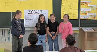 Sie brachte uns bei, wie man mit dem Internet richtig umgeht und zeigte uns die Gefahren des Internets. Sie teilte uns in Gruppen auf und dann versuchten wir den Master Code zu knacken, denn das Schulnetzwerk wurde gehackt. Um den Master Code zu lösen, mussten wir Aufgaben auf Plakaten lösen, die wir dann unseren Eltern am Nachmittag vorstellten. Dafür mussten wir an den verschiedenen Stationen Arbeitsblätter bearbeiten, damit wir eine Zahl herausbekommen konnten, um den Code knacken zu können. Bei den Aufgaben ging es um das Thema „Zocken“, „Chatten und Texten“, „Stress“ und „Cybermobbing“.